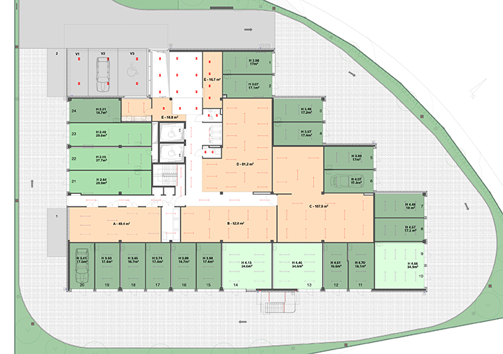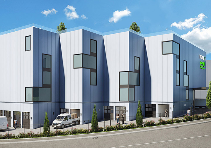 Le rez-de-chaussée se compose de 23 boxes adaptés aux PME souhaitant s’installer dans un lieu propice aux activités administratives, artisanales ou de stockage, ainsi que des surfaces entièrement modulables.