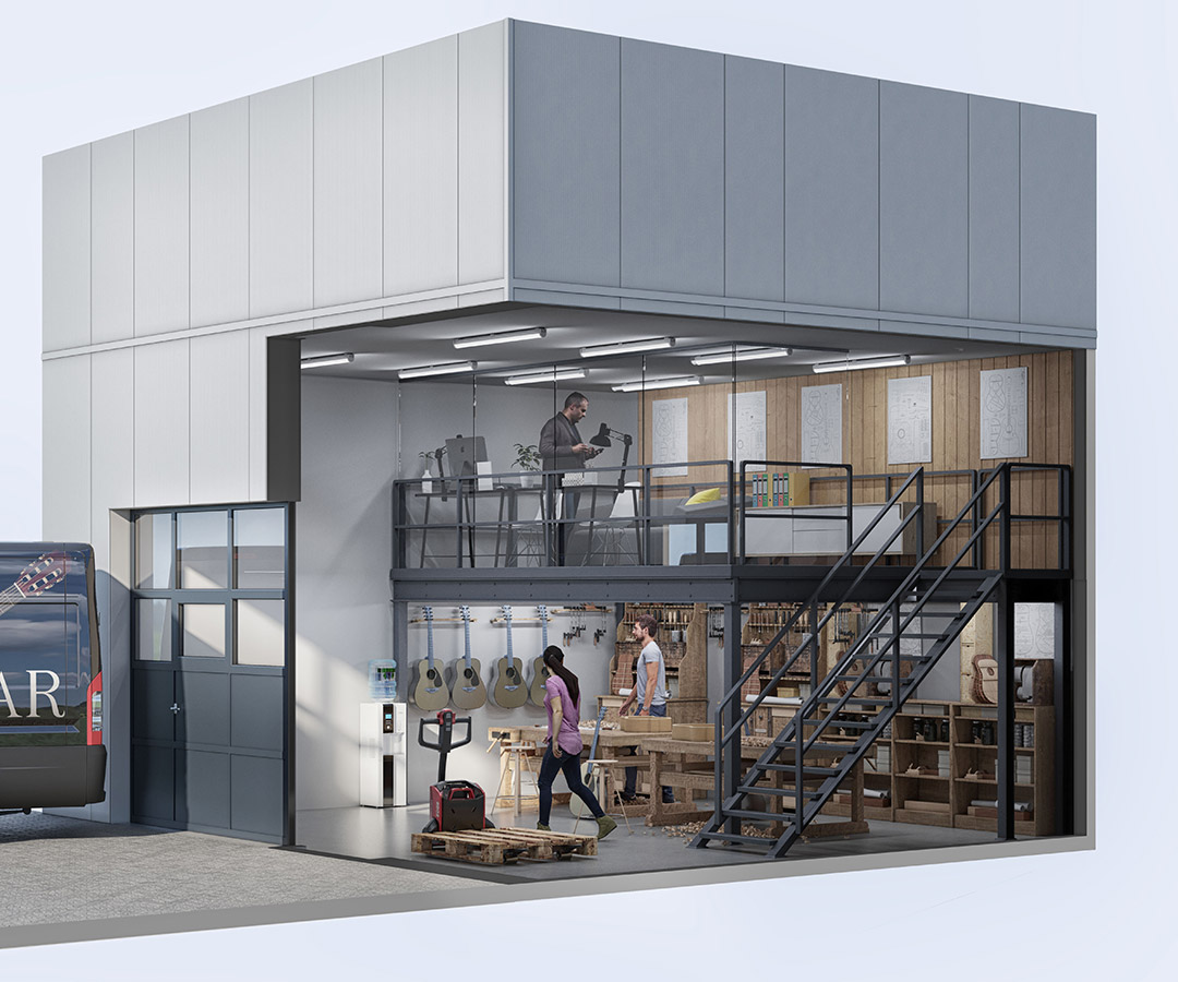 Les boxes sont tempérés et équipés d’une installation électrique facilement adaptable, ainsi qu’un évier. Les triples vitrages en façade offrent un apport généreux de lumière.
