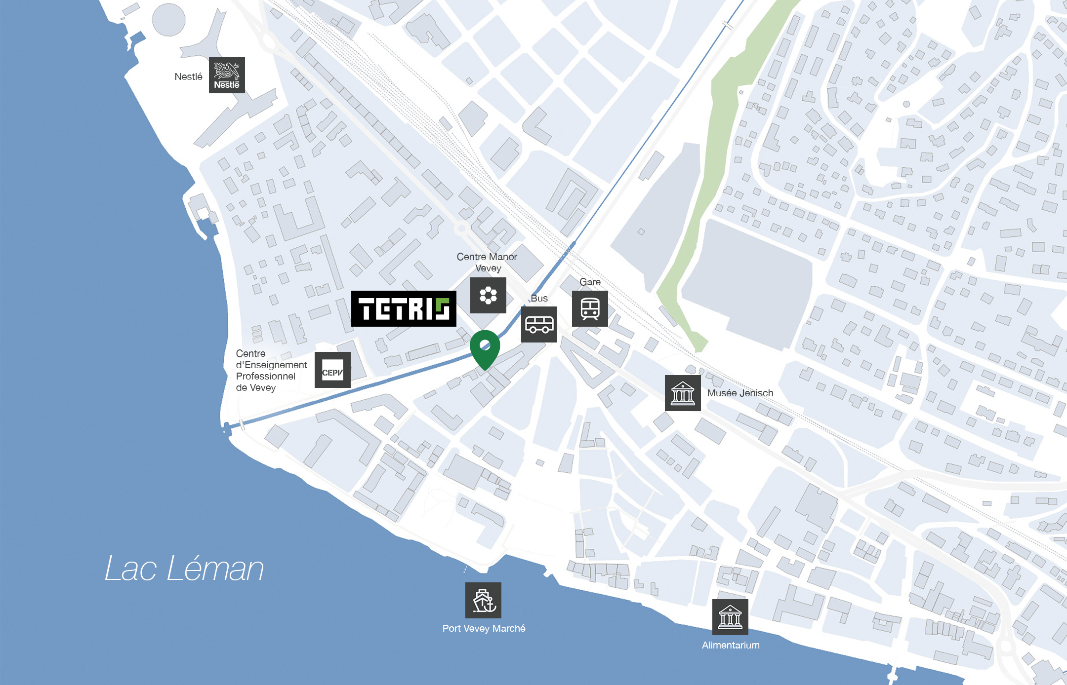 Situé au coeur de la ville, à côté de l’hôtel Base Vevey, Tetris Vevey prend place dans un endroit stratégique à 2 minutes à pied de la gare et de nombreuses lignes de bus et à 10 minutes en voiture de l’autoroute.